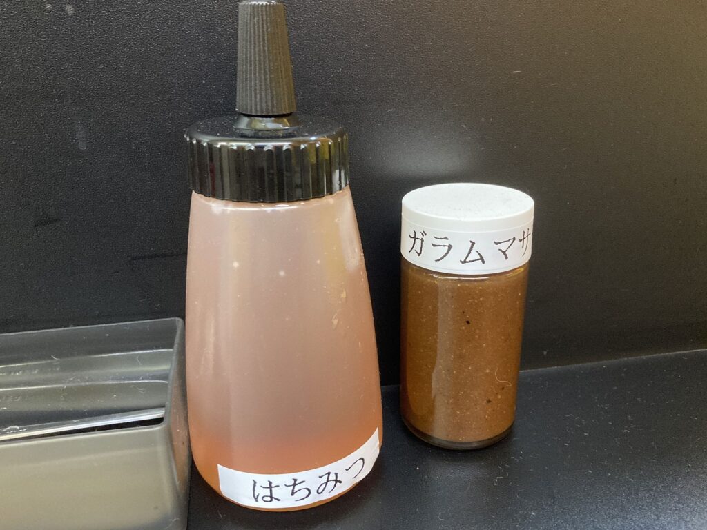 味変として、ガラムマサラとはちみつが備え付けられています。