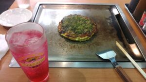 鉄板焼ではよくある焼きそばですが、甘辛いソースと、あとのせの青ネギがシャキシャキで、サッパリとした赤しそチューハイとよく合います。