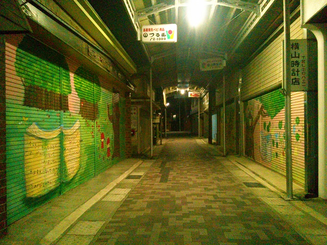 ナメラ商店街は夜も電気がついているので、女性の独り歩きも安心です。
