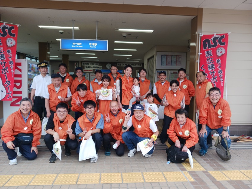 時折小雨が降る中、本企画を主催いただいた粟生線サポーターズくらぶ運営委員の森川さんをはじめ、事前にご応募いただきました方々、沿線自治体の方々、神戸電鉄鈴蘭台駅長等も参加いただき、総勢23名での駅清掃活動となりました。